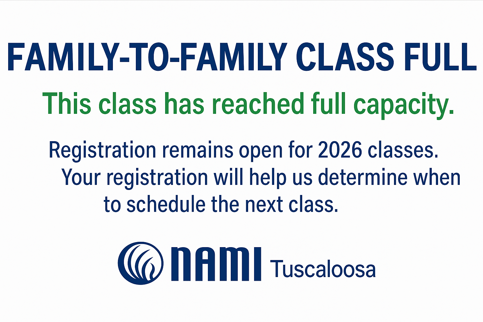 NAMI Tuscaloosa is your local resource for mental health education, support, and advocacy. As part of the National Alliance on Mental Illness, we are dedicated to improving the lives of individuals and families affected by mental illness in our community.